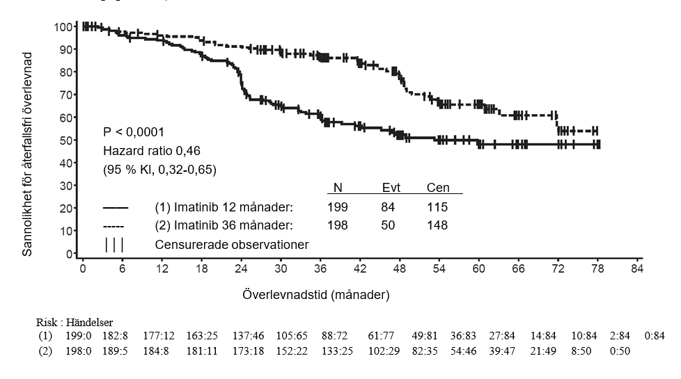 Trettiosex (36) månaders behandling med imatinib förlängde signifikant RFS jämfört med 12 månaders behandling med imatinib (hazard ratio (HR) = 0,46 [0,32-0,65], p<0,0001) (Tabell 8, Figur 1).