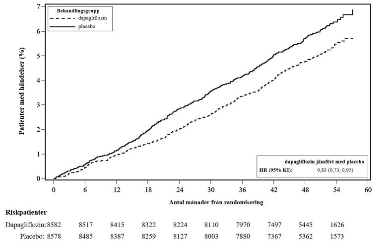 Dapagliflozin reducerade förekomsten av komponenterna i det sammansatta renala effektmåttet; varaktig minskning i eGFR, njursjukdom i slutstadiet, renal eller kardiovaskulär död. Skillnaden mellan grupperna drevs av färre antal händelser av renala komponenter; varaktig minskning i eGFR, njursjukdom i slutstadiet och renal död (figur 2).