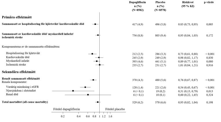 Resultat för primära och sekundära effektmått visas i figur 2. Dapagliflozins överlägsenhet över placebo visades inte för MACE (p = 0,172). Det renala sammansatta effektmåttet och mortalitet av alla orsaker testades därför inte som en del av den konfirmerande testproceduren.