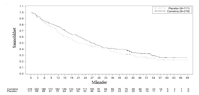 Den slutliga analysen av OS utfördes efter att 218 händelser (dödsfall) inträffat och visar på en trend av ökad medianöverlevnad på 5,5 månader i kabozantinibarmen: median (månader) 26,6 för kabozantinib jämfört med 21,1 för placebo (HR = 0,85 [95% konfidensintervall: 0,64, 1,12], p värde = 0,2409).