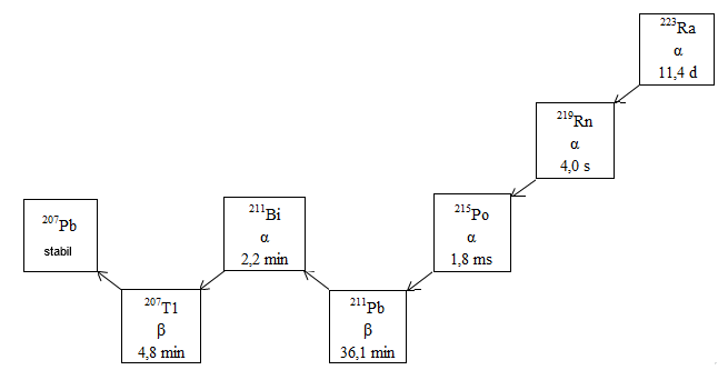 Det sexfasiga sönderfallet av radium‑223 till bly‑207 sker via kortlivade dotterisotoper och åtföljs av ett antal alfa-, beta- och gammaemissioner med olika energinivåer och emissionssannolikheter. Alfastrålning står för 95,3 % av den energi som avges från radium‑223 och dess dotterisotoper (energiintervall 5,0‑7,5 MeV). Betastrålning står för 3,6 % (genomsnittliga energinivåer är 0,445 MeV och 0,492