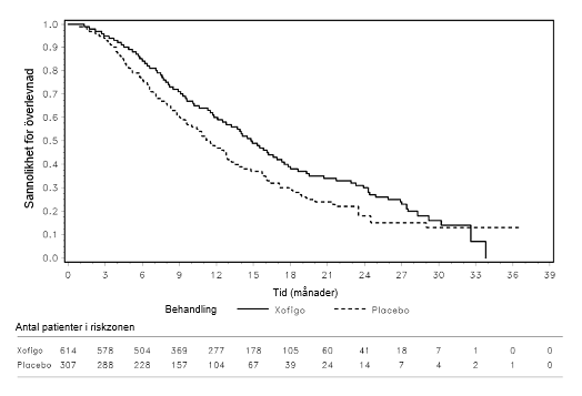 Resultaten av både interimsanalysen och den uppdaterade analysen visade att den totala överlevnaden var signifikant längre hos patienter som behandlades med Xofigo plus bästa understödjande behandling jämfört med patienter som behandlades med placebo plus bästa understödjande behandling (se tabell 2 och figur 2). En större andel dödsfall som inte var relaterade till prostatacancer observerades i placebo-gruppen (26/541, 4,8 % i Xofigo-armen jämfört med 23/268, 8,6 % i placebo-armen).