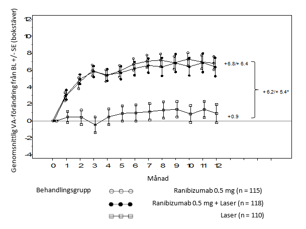 Effekten vid månad 12 var likartad i de flesta subgrupperna. Patienter med BCVA vid baslinjen >73 bokstäver och makulaödem med central retinal tjocklek på <300 µm verkade inte ha någon nytta av behandling med ranibizumab jämfört med fotokoagulation med laser.