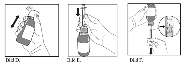 Flaskan ska hållas i upprätt position och sprutan föras in ordentligt i adapterns hål överst på flaskan (bild E).