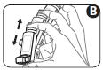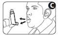 4. Håll inhalatorn upprätt med tummen på bottendelen, under munstycket. Andas ut så långt som känns bekvämt (bild C). Andas inte in igen.