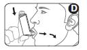 6. Andas in genom munnen. Just som du börjar andas in, tryck ned toppen av behållaren för att spraya en dos. Fortsätt att andas lugnt och djupt (bild D).