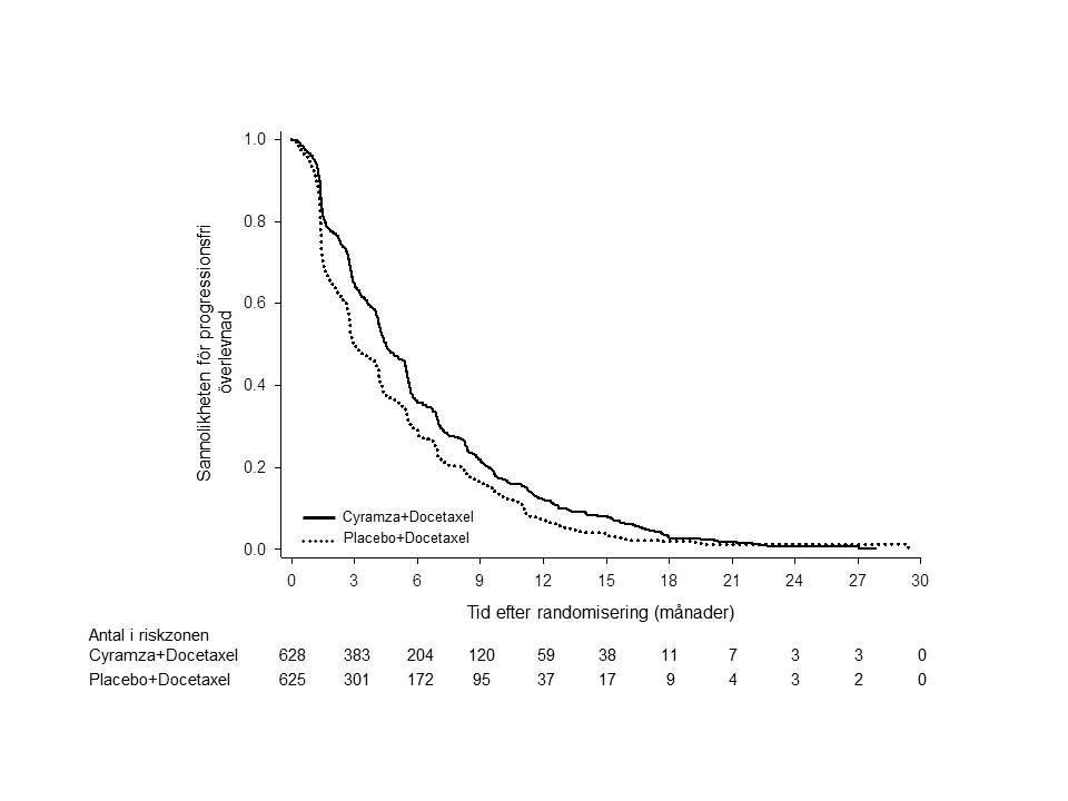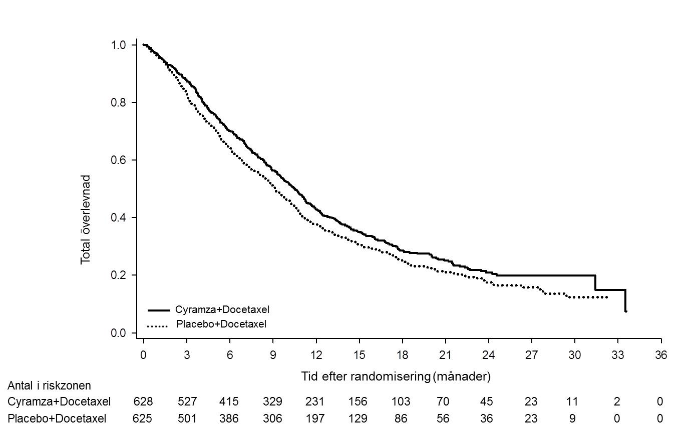 Total överlevnad var statistiskt signifikant bättre hos patienter som fick Cyramza plus docetaxel jämfört med patienter som fick placebo plus docetaxel (riskkvot [HR] 0,857; 95 % KI: 0,751-0,979; p=0,024). En ökning av medianöverlevnad på 1,4 månader sågs, till fördel för gruppen Cyramzaplus docetaxel:10,5 månader i gruppen som fick Cyramza plus docetaxel och 9,1 månader i gruppen som fick placebo plus docetaxel. Progressionsfri överlevnad (PFS) var statistiskt signifikant bättre hos patienter som fick Cyramza plus docetaxel jämfört med patienter som fick placebo plus docetaxel (riskkvot [HR] 0,762; 95 % KI: 0,677-0,859; p<0,001). En ökning av median PFS på 1,5 månader sågs, till fördel för gruppen Cyramza plus docetaxel; 4,5 månader i gruppen som fick Cyramza plus docetaxel och 3 månader i gruppen som fick placebo plus docetaxel. Objektiv svarsfrekvens, ORR, (fullständigt svar [CR] + partiellt svar [PR]) var signifikant bättre hos patienter som fick Cyramza plus docetaxel jämfört med patienter som fick placebo plus docetaxel (22,9 % jämfört med 13,6 %, p<0,001). Den primära analysen av livskvalitet visade liknande tid till försämring för samtliga Lung Cancer Symptom Scale (LCSS) poäng mellan behandlingsgrupperna.