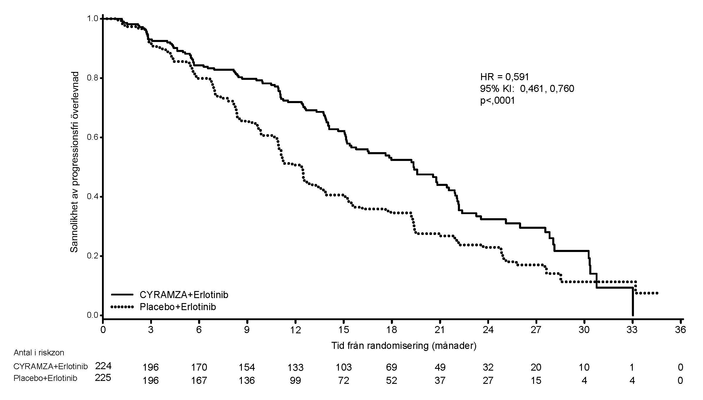 Figur 6: Kaplan-Meier-kurvor över progressionsfri överlevnad för Cyramza plus erlotinib jämfört med placebo plus erlotinib i RELAY