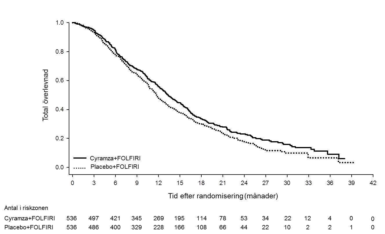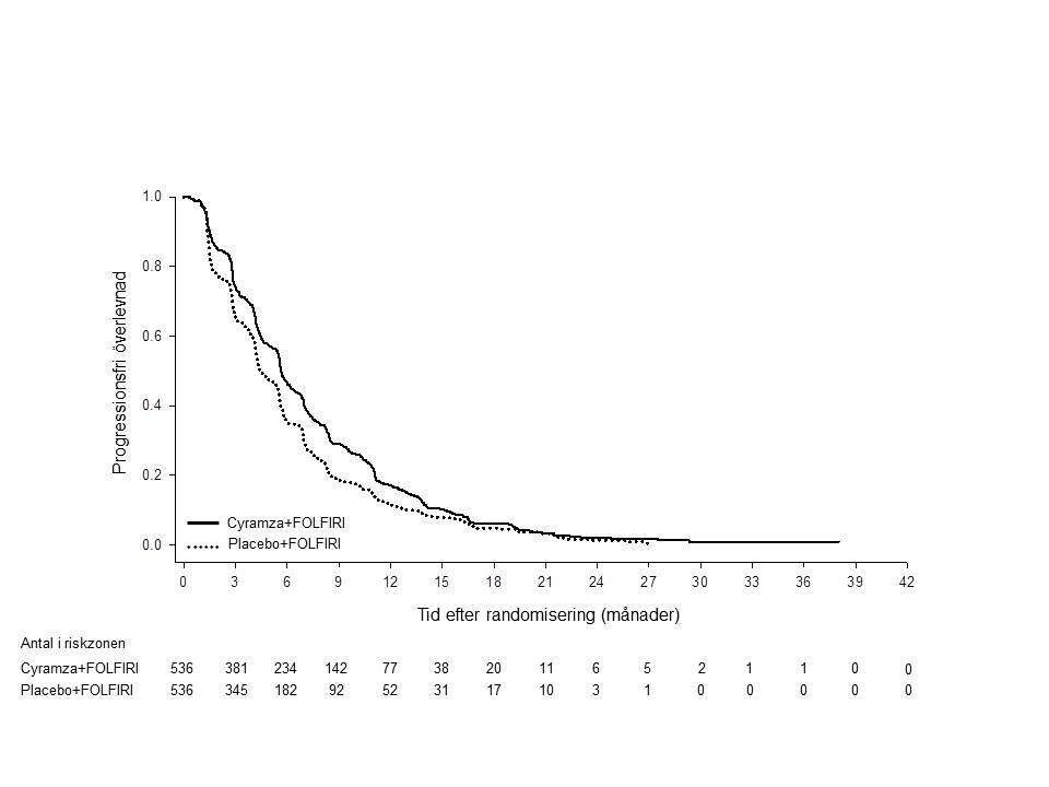 I REACH-2 var basline patientdemografi och sjukdomskarakteristiska generellt balanserat mellan armarna, bortsett från AFP, som var lägre i placeboarmen. Patienter behandlade med Cyramza upplevde en statistiskt signifikant förbättring i OS jämfört med placebo (tabell 14). Det primära effektmåttet i REACH-2 supporterades av en statistikt signifikant förbättring av progressionsfri överlevnad hos patienter behandlade med Cyramza jämfört med placebobehandlade patienter. Den relativa behandlingseffekten (bedömd med HR) av Cyramza jämfört med placebo var generellt konsekvent över subgrupperna, inklusive ålder, etnisk tillhörighet, sjukdomsetiologi och anledning till utsättning av sorafenib (sjukdomsprogression jämfört med intolerans). Ett relevant samband mellan exponering och effekt observerades för ramucirumab i REACH-2 (se avsnitt 5.2). REACH-2 effektresultat visas i tabell 14 och figur 9.