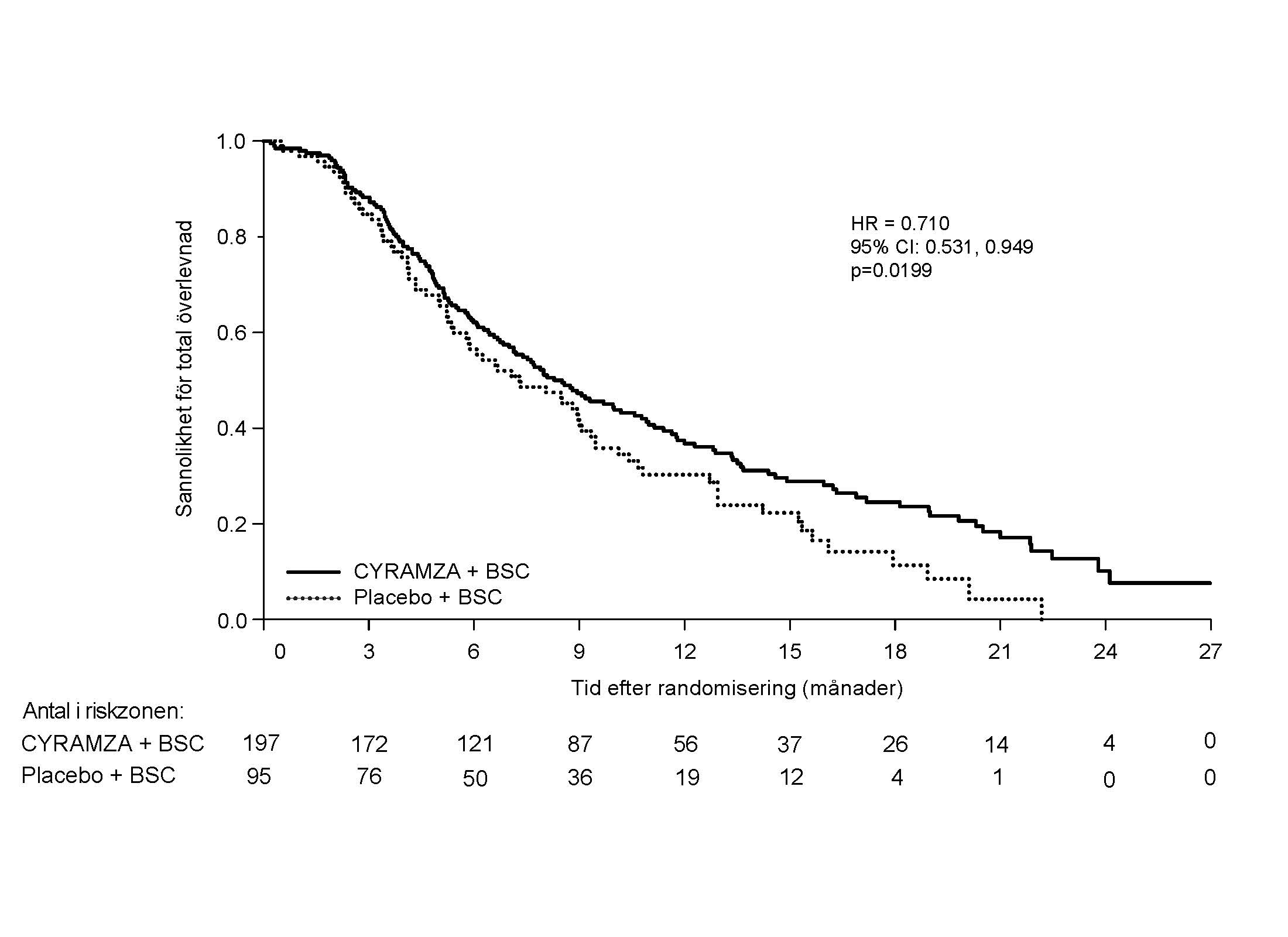 Figur 9: Kaplan-Meier kurvor över total överlevnad för Cyramza jämfört med placebo i REACH-2