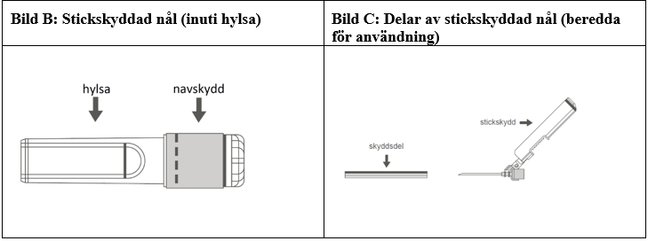 Bruksanvisning för användning av stickskyddad nål med förfylld Luer Lock-spruta