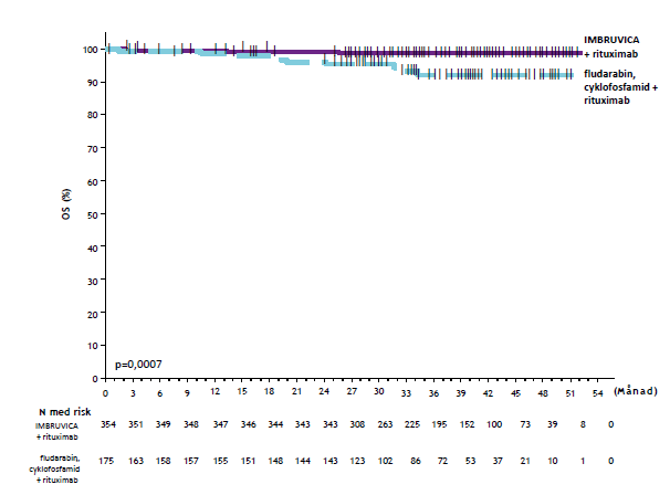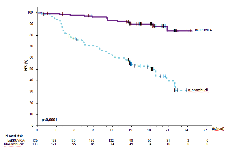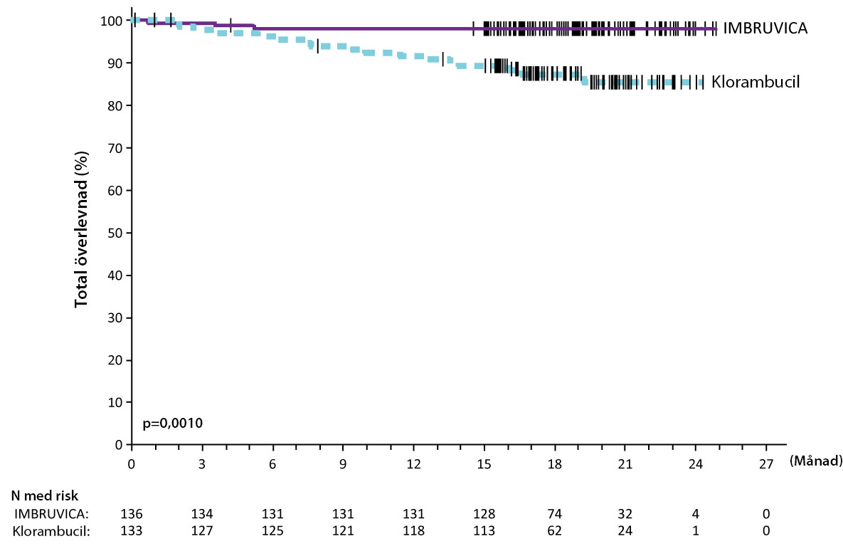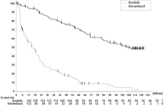 Progressionsfri överlevnad (Progression Free Survival, PFS), bedömd av en IRC enligt IWCLL‑kriterier, indikerade en statistiskt signifikant riskminskning på 78 % för dödsfall eller progression för patienter i IMBRUVICA‑gruppen. Analys av OS visade en statistiskt signifikant riskminskning på 57 % för dödsfall för patienter i IMBRUVICA‑gruppen. Effektresultat för studie PCYC‑1112‑CA visas i tabell 16.