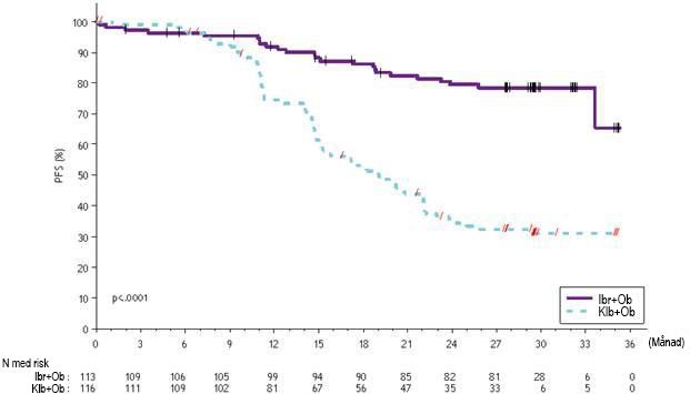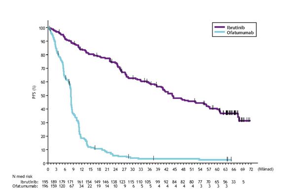 b Patienter randomiserade till att få ofatumumab censurerades bort när behandling med IMBRUVICA påbörjades om det var tillämpligt.