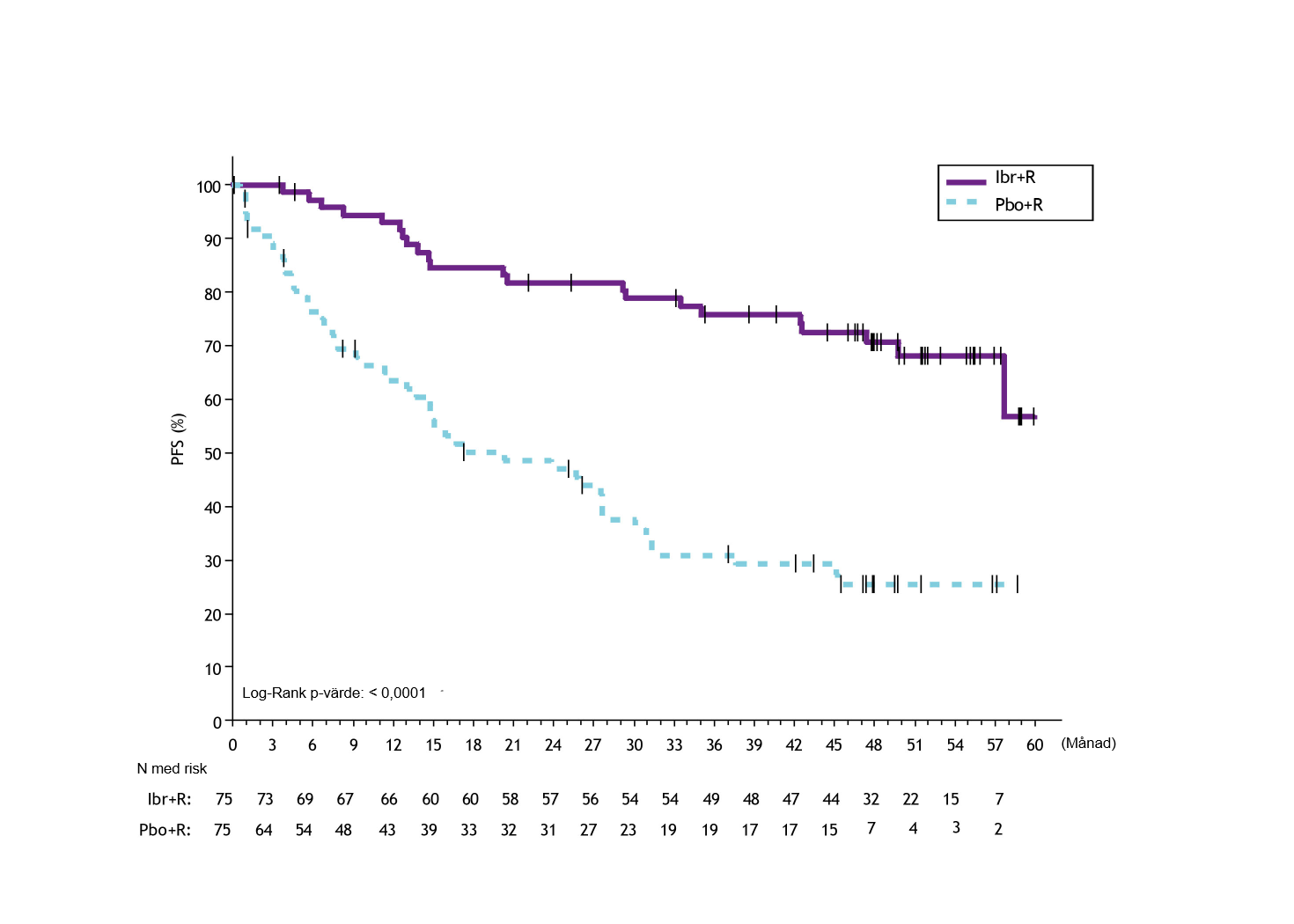I den primära analysen, med en medianuppföljningstid på 26,5 månader, var den IRC-bedömda riskkvoten för PFS 0,20 (95 % CI [0,11; 0,38]). Riskkvoter för PFS för behandling av behandlingsnaiva patienter, tidigare behandlade patienter och patienter med eller utan MYD88 L265P-mutationer överensstämde med riskkvoten för PFS för ITT-populationen.
