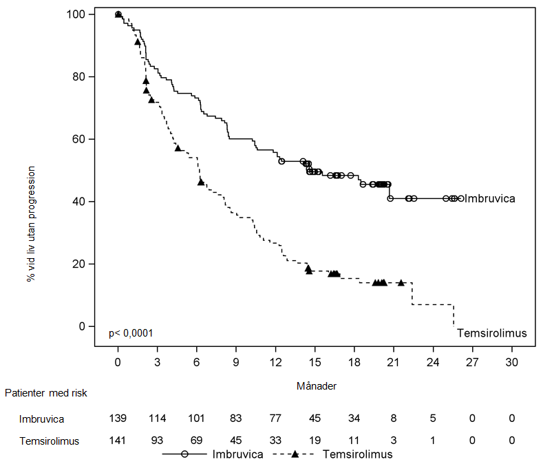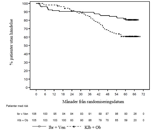 Med en övergripande uppföljning på 63 månader visas effektresultaten som bedömdes av en IRC vid tidpunkten för den slutliga analysen för PCYC-1127-CA i tabell 20, och Kaplan-Meier-kurvan för PFS visas i figur 14. Riskkvoter för PFS för behandlingsnaiva patienter (0,31 [95 % CI (0,14; 0,69)]) och tidigare behandlade patienter (0,22 [95 % CI (0,11; 0,43)]) överensstämde med riskkvoten för PFS för ITT-populationen.