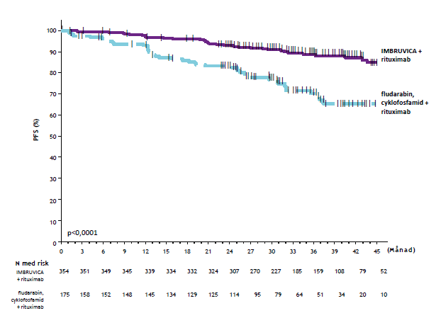 Med en medianuppföljningstid på 65 månader i studie PCYC-1112-CA observerades en 85 % minskning av risken för dödsfall eller progression enligt prövarens bedömning för patienter i IMBRUVICA-gruppen. Medianen för prövarbedömd PFS enligt IWCLL-kriterierna var 44,1 månader [95 % CI (38,47; 56,18)] i IMBRUVICA-gruppen respektive 8,1 månader [95 % CI (7,79; 8,25)] i ofatumumabgruppen; HR = 0,15 [95 % CI (0,11; 0,20)]. Den uppdaterade Kaplan-Meier-kurvan för PFS visas i figur 13. Prövarbedömd ORR i IMBRUVICA-gruppen var 87,7 % jämfört med 22,4 % i ofatumumabgruppen. Vid tidpunkten för den slutliga analysen hade 133 (67,9 %) av de 196 försökspersonerna som ursprungligen randomiserats till behandlingsgruppen med ofatumumab gått över till ibrutinibbehandlingen. Medianen för prövarbedömd PFS2 (tid från randomisering till PFS-händelse efter första efterföljande antineoplastiska behandlingen) enligt IWCLL kriterierna var 65,4 månader [95 % CI (51,61; kan inte uppskattas)] i IMBRUVICA-gruppen respektive 38,5 månader [95 % CI (19,98; 47,24)] i ofatumumabgruppen; HR = 0,54 [95 % CI (0,41; 0,71)]. Medianen för OS var 67,7 månader [95 % CI (61,0; kan inte uppskattas)] i IMBRUVICA-gruppen.