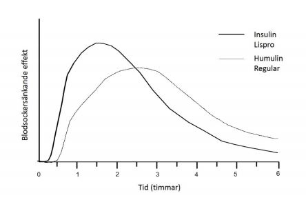Insulin lispro har en snabbt insättande effekt (ca 15 minuter) och kan därför ges närmare måltid (inom 0 till 15 minuter) jämfört med lösligt insulin (30 till 45 minuter före måltid). Insulin lispro har snabbare insättande effekt och kortare duration (2 till 5 timmar) än vanligt insulin.