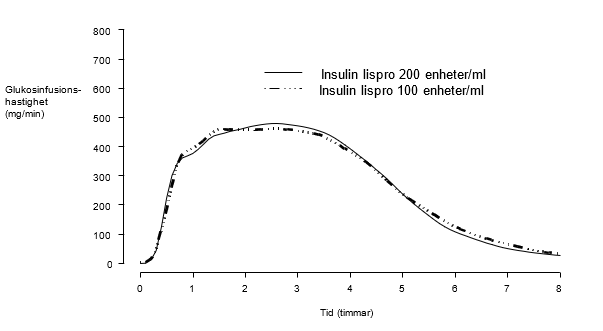 De farmakodynamiska svaren av insulin lispro för 200 enheter/ml för injektion liknar de som setts för 100 enheter/ml lösning för injektion efter subkutan administrering av en singeldos på 20 enheter hos friska frivilliga såsom visas i grafen nedan (figur 2).