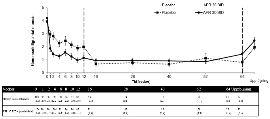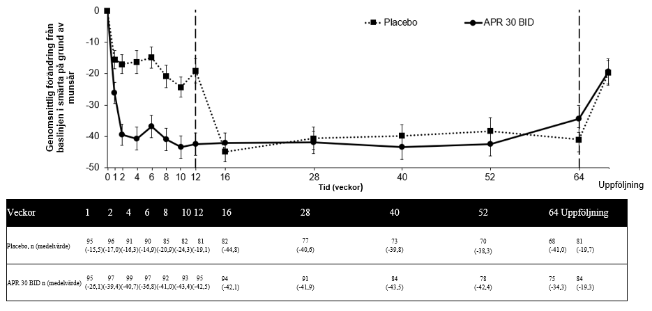 Av de 104 patienter som ursprungligen randomiserades till apremilast 30 mg två gånger om dagen, fortsatte 75 patienter (ungefär 72 %) att genomgå denna behandling vid vecka 64. En signifikant minskning av det genomsnittliga antalet munsår och smärtan på grund av munsår observerades i behandlingsgruppen som tog apremilast 30 mg två gånger om dagen jämfört med placebogruppen vid varje besök, så tidigt som vecka 1, till och med vecka 12 för antal munsår (p≤0,0015) och för smärta på grund av munsår (p≤0,0035). Bland patienter som behandlades kontinuerligt med apremilast och var kvar i studien, observerades förbättringar av munsår och minskad smärta på grund av munsår under vecka 64 (figur 3 och 4).