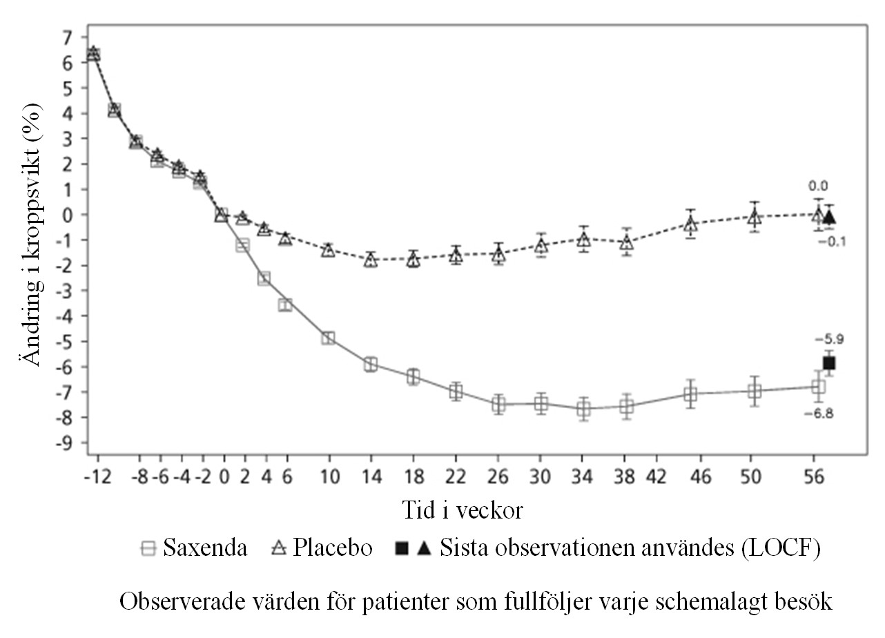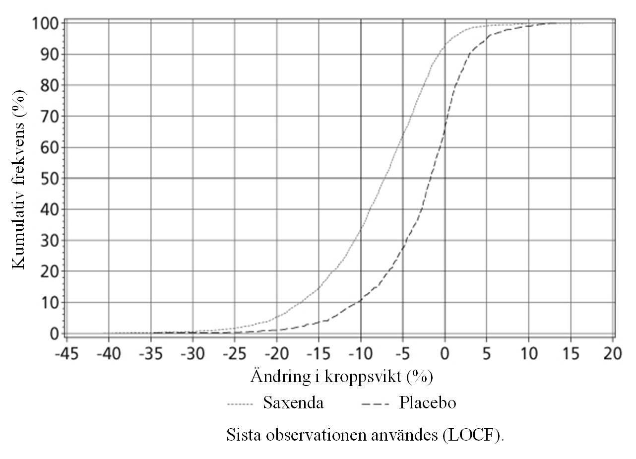Behandling med 3,0 mg Saxenda dagligen ska avbrytas efter 12 veckor om patienten inte har förlorat minst 5% av sin initiala kroppsvikt.