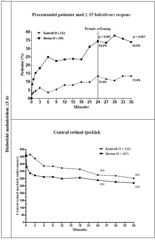 När effekten bedömdes som en funktion av sjukdomsduration, visade försökspersoner med diabetiskt makulaödem med en duration som var längre än mediandurationen (≥3 år) ett signifikant fördelaktigt svar på Iluvien, medan de med diabetiskt makulaödem med kortare duration inte visade någon ytterligare fördel jämfört med kontrollbehandling med avseende på synförbättring (figur 2 och 3). Dessa subgruppsdata stödjer indikationen i avsnitt 4.1 för användning hos patienter med kroniskt diabetiskt makulaödem (dvs. en duration på minst 3 år).