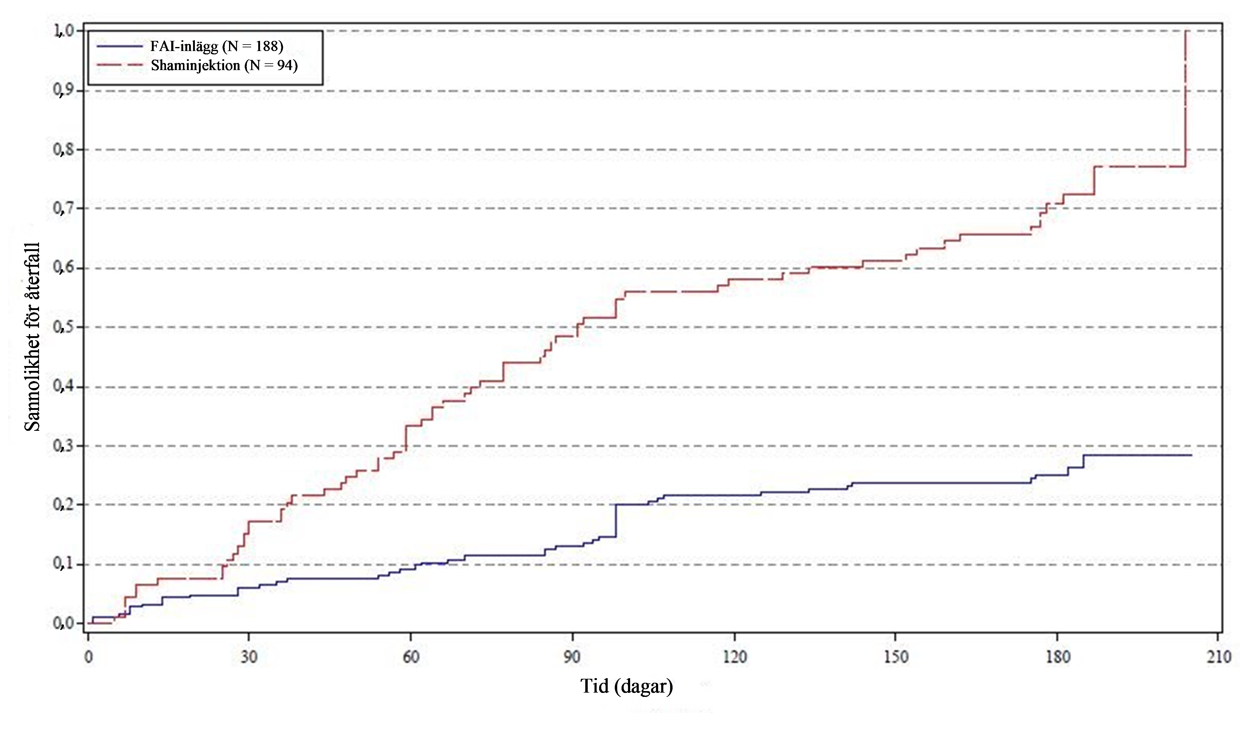 Patienter som behandlades med Iluvien upplevde signifikant färre återfall inom 36 månader än de som behandlades med sham (1,7 återfall jämfört med 5,3 återfall, p=0,001).