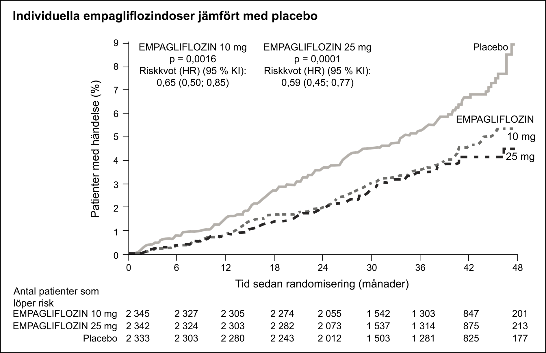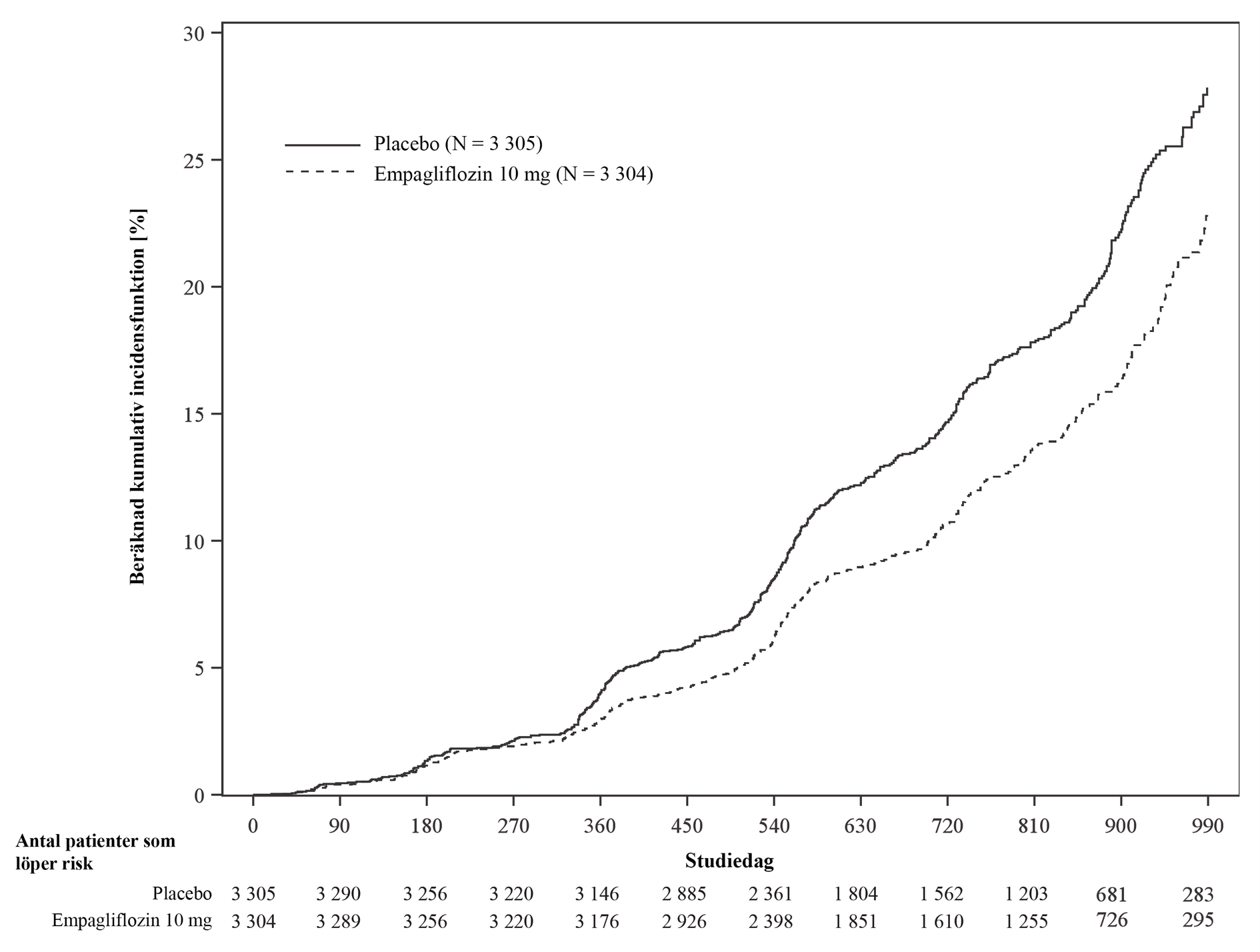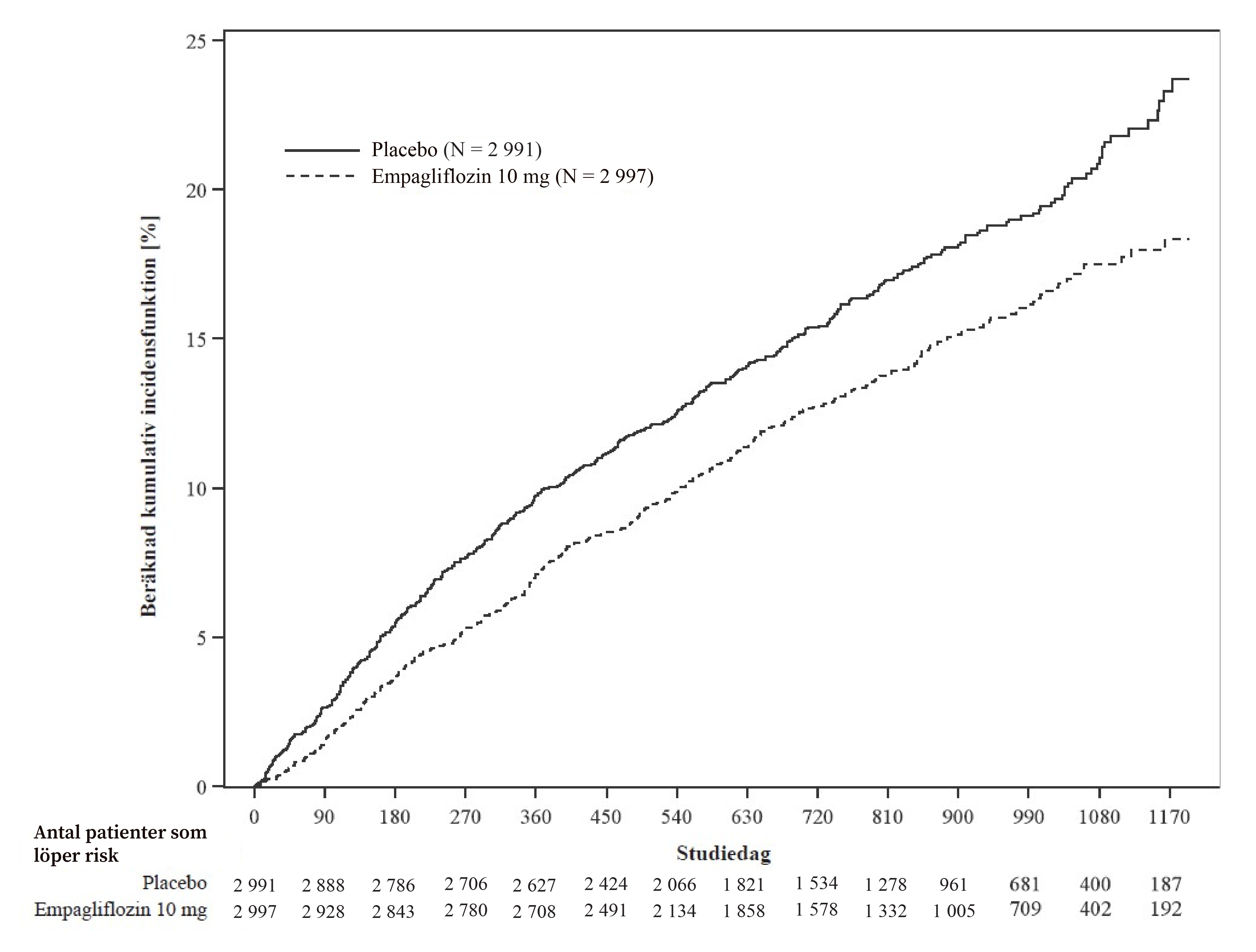 Jämfört med placebo var empagliflozin överlägset gällande minskning av risken för det primära sammansatta effektmåttet kardiovaskulär död eller sjukhusinläggning på grund av hjärtsvikt. Dessutom minskade empagliflozin signifikant risken för förekomst av HHF (första och återkommande) och minskade signifikant graden av eGFR-försämring över tid (tabell 13; figur 3).