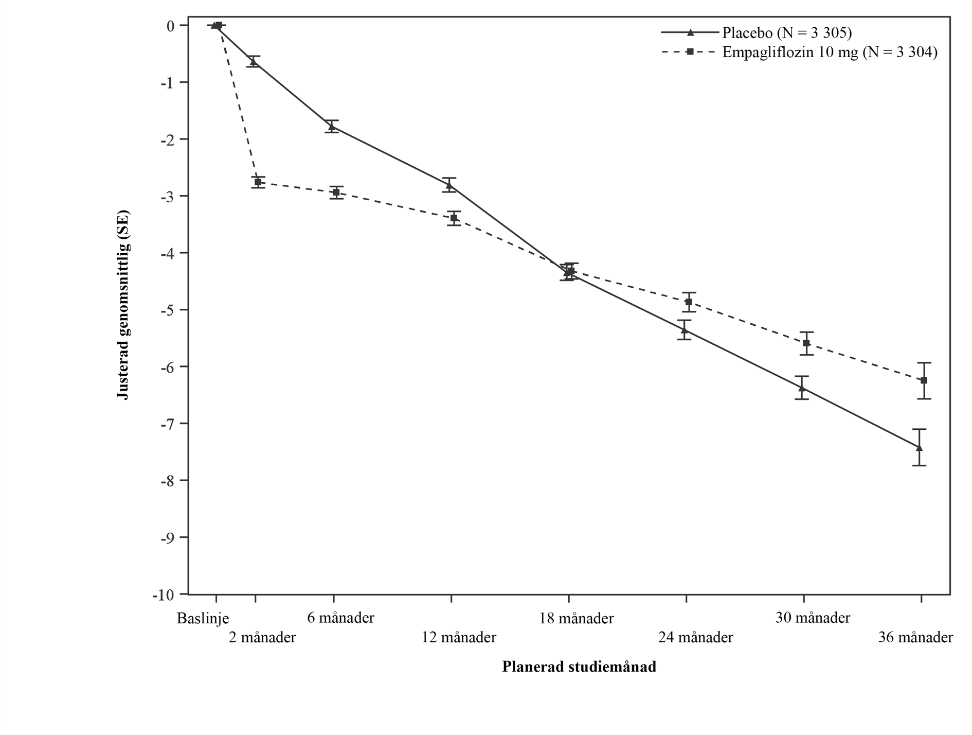 **Förändringsgraden av eGFR analyserades baserat på behandlad grupp. Interceptet är ‑0,18 ml/min/1,73 m2 för placebo och ‑3,02 ml/min/1,73 m2 för empagliflozin. Interceptet representerar den akuta effekten på eGFR medan lutningsgraden representerar den långsiktiga effekten.