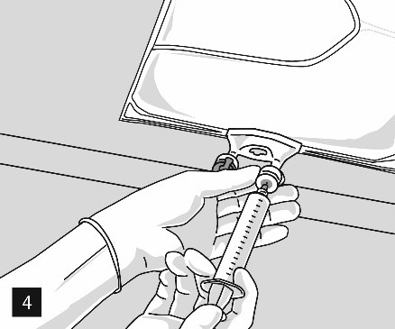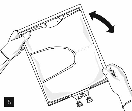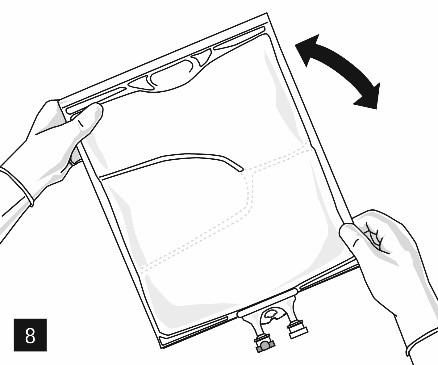 När aluminiumförseglingen (fig. 3) har tagits bort går det att tillföra kompatibla vattenlösliga tillsatser via tillsatssporten (fig. 4) till de klara vattenlösningarna. Blanda innehållet i påsen noggrant (fig. 5) och inspektera blandningen visuellt för fällningar (fig. 6). Endast klara lösningar får användas.