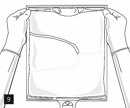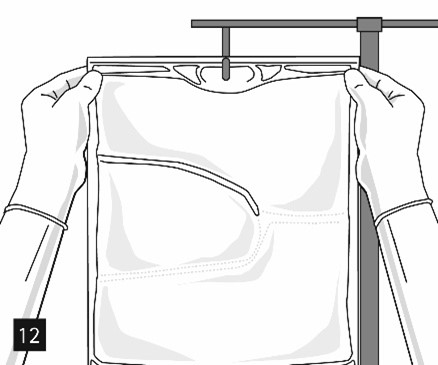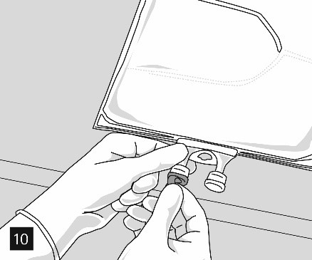 Ta bort aluminiumfolien (fig. 10) från infusionsporten och anslut infusionsaggregatet (fig. 11). Använd ett oluftat infusionsaggregat eller stäng luftventilen vid användning av ett luftat aggregat. Häng upp påsen på infusionsställningen (fig. 12) och ge infusionen med standardteknik.