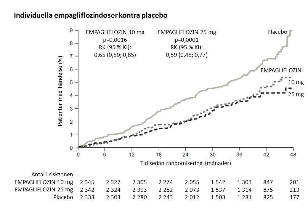 Den glykemiska effekten av empagliflozin är beroende av njurfunktionen. Hos patienter med eGFR <60 ml/min/1,73 m2 (se tabell 1) ska, som tillägg till standardbehandling, en daglig dos på 10 mg empagliflozin ges för kardiovaskulär riskreduktion. Då den glukossänkande effekten av empagliflozin är reducerad hos patienter med måttligt nedsatt njurfunktion, och sannolikt saknas hos patienter med kraftigt nedsatt njurfunktion, ska tillägg av andra blodglukossänkande medel övervägas vid behov av ytterligare glykemisk kontroll.