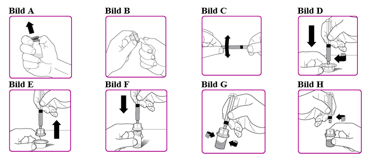 Snurra försiktigt (med en cirkelrörelse) injektionsflaskan med pulver utan att avlägsna sprutan tills allt pulver har lösts upp/rekonstituerats helt (bild G). Den rekonstituerade lösningen ska inspekteras visuellt för partiklar före administrering. Får ej användas om partiklar eller missfärgning observeras.