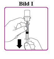 Vänd på injektionsflaskan och tryck in luften i sprutan i injektionsflaskan och dra upp rekonstituerat OBIZUR i sprutan (bild I).