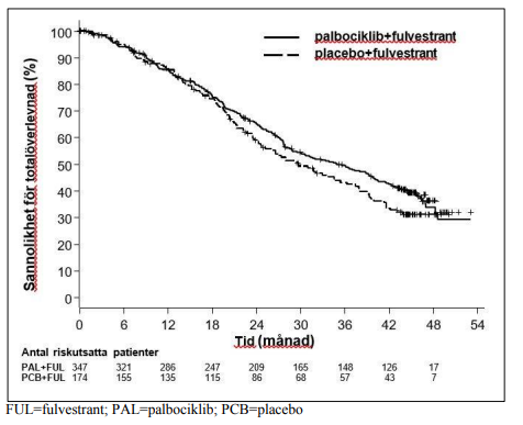 Efter en medianuppföljningstid på 45 månader utfördes den slutliga OS-analysen baserad på 310 händelser (60 % av de randomiserade patienterna). En skillnad på 6,9 månader i median OS observerades i armen palbociklib plus fulvestrant jämfört med armen placebo plus fulvestrant; resultatet var inte statistiskt signifikant vid den förspecificerade signifikansnivån på 0,0235 (1-sidig). I armen placebo plus fulvestrant fick 15,5 % av de randomiserade patienterna palbociklib och andra CDK-hämmare som efterföljande behandlingar efter progression.