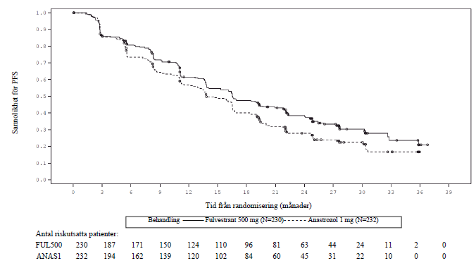 En fas 3, randomiserad, dubbelblind, dubbelplacebo, multicenterstudie av fulvestrant 500 mg jämfört med anastrozol 1 mg utfördes på postmenopausala kvinnor med ER-positiv och/eller PgR-positiv lokalt avancerad eller metastatisk bröstcancer som inte tidigare behandlats med någon hormonell behandling. Totalt randomiserades 462 patienter 1:1 i följd att få antingen fulvestrant 500 mg eller anastrozol 1 mg.
