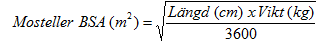 Barndos (mg) = 7 x BSA x ClcrS (se Mosteller BSA-formel och Schwartz kreatininclearance-formel nedan).