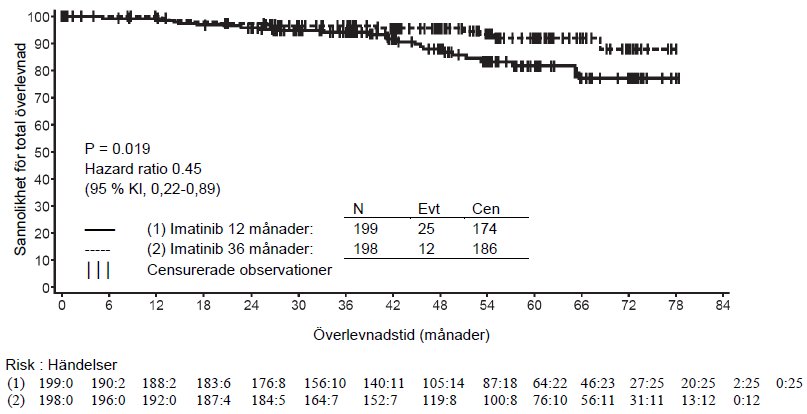 Dessutom förlängde 36 månaders behandling med imatinib signifikant den totala överlevnaden (TÖ) jämfört med 12 månaders behandling med imatinib (HR = 0,45 [0,22, 0,89], p = 0,0187) (tabell 8, figur 2).