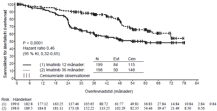 Trettiosex (36) månaders behandling med imatinib förlängde signifikant RFS jämfört med 12 månaders behandling med imatinib (hazard ratio [HR] = 0,46 [0,32, 0,65], p < 0,0001) (tabell 8, figur 1).