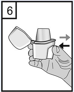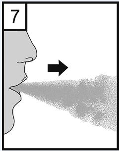 7. Andas ut fullständigt. Det är viktigt att utandningen inte sker genom munstycket. Undvik alltid att andas ut genom munstycket.