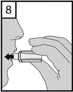 8. Placera munstycket i munnen och håll huvudet upprätt. Slut läpparna tätt runt munstycket och andas in tillräckligt långsamt och djupt så att du hör eller känner kapseln vibrera inne i kammaren. Håll andan så länge det går utan obehag och ta samtidigt bort inhalatorn från munnen. Återgå till normal andning. Upprepa steg 7-8 för att tömma kapseln fullständigt.
