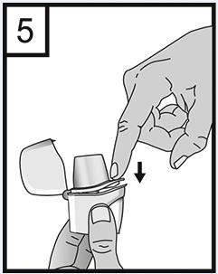 6. Håll inhalatorn med munstycket uppåt och tryck med ett bestämt tryck in knappen fullständigt en gång och släpp den åter. Därigenom gör du hål i kapseln så att läkemedlet frigörs vid inandning.