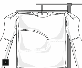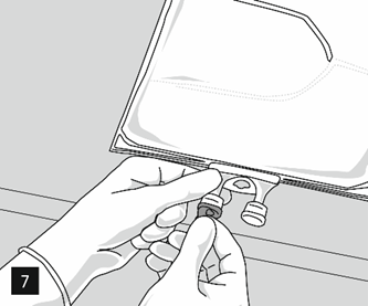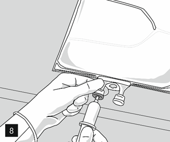 Ta bort aluminiumfolien från infusionsporten (fig. 7) och anslut infusionsaggregatet (fig. 8). Använd ett oluftat infusionsaggregat eller stäng luftventilen vid användning av ett luftat aggregat. Häng upp påsen på infusionsställningen (fig. 9) och ge infusionen med standardteknik.