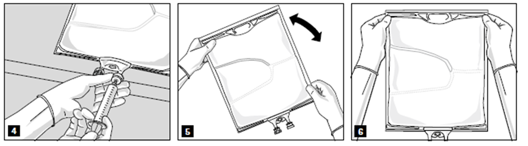 Efter att alla kamrar har blandats och när aluminiumförseglingen har tagits bort (fig. 3A) går det att tillföra kompatibla tillsatser via tillsatsporten (fig. 4). Blanda innehållet noggrant (fig. 5) och inspektera blandningen visuellt (fig. 6). Blandningen är en mjölkvit, homogen olja i vatten-emulsion.