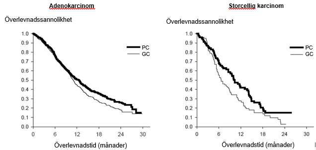 Analysen av den inverkan histologin av icke-småcellig lungcancer har på OS visade kliniskt relevanta skillnader beträffande överlevnad beroende på histologi, se tabellen nedan.