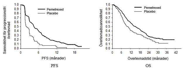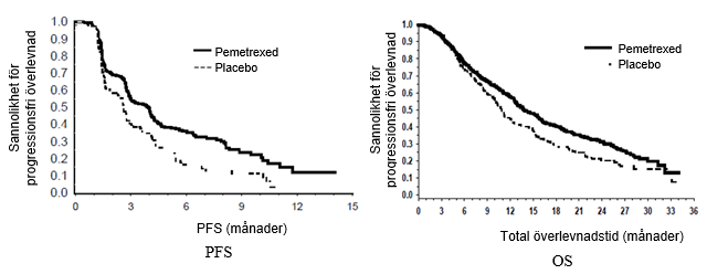 Studien uppfyllde primärt effektmått och visade en statistiskt signifikant förbättring i PFS i pemetrexed armen jämfört med placebo-armen (n = 581, oberoende granskning av populationen, medianvärde 4 respektive 2 månader) (riskförhållande = 0,60, 95 % KI: 0,49-0,73, p < 0,00001). Den oberoende undersökningen av patientbilderna bekräftade resultatet av prövarens bedömning av PFS. Medianvärdet för OS i hela populationen (n = 663) var 13,4 månader med pemetrexed och 10,6 månader med placebo, riskförhållande = 0,79 (95 % KI: 0,65-0,95, p = 0,01192).