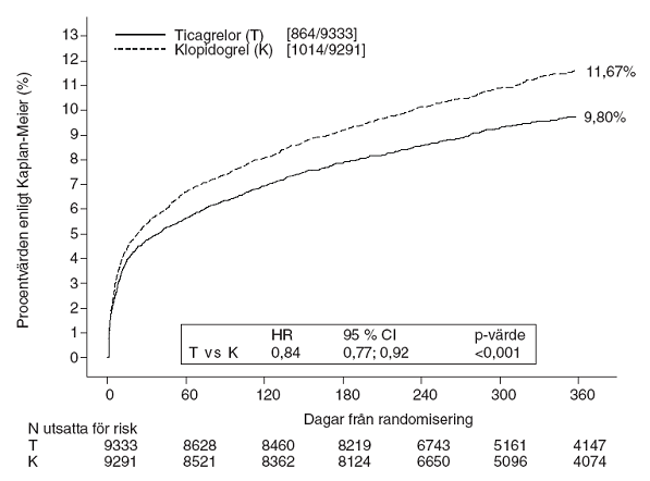 Resultatet visade sig tidigt (absolut riskreduktion [ARR] 0,6 % och relativ riskreduktion [RRR] 12 % efter 30 dagar), med en konstant behandlingseffekt under hela tolvmånadersperioden som gav en ARR på 1,9 % per år med en RRR på 16 %. Detta tyder på att det är lämpligt att behandla patienterna med tikagrelor 90 mg två gånger dagligen i 12 månader (se avsnitt 4.2). Behandling av 54 patienter med akut kranskärlssjukdom med tikagrelor i stället för klopidogrel förhindrar 1 aterotrombotisk händelse; behandling av 91 förhindrar 1 kardiovaskulär död (se figur 1 och tabell 4).