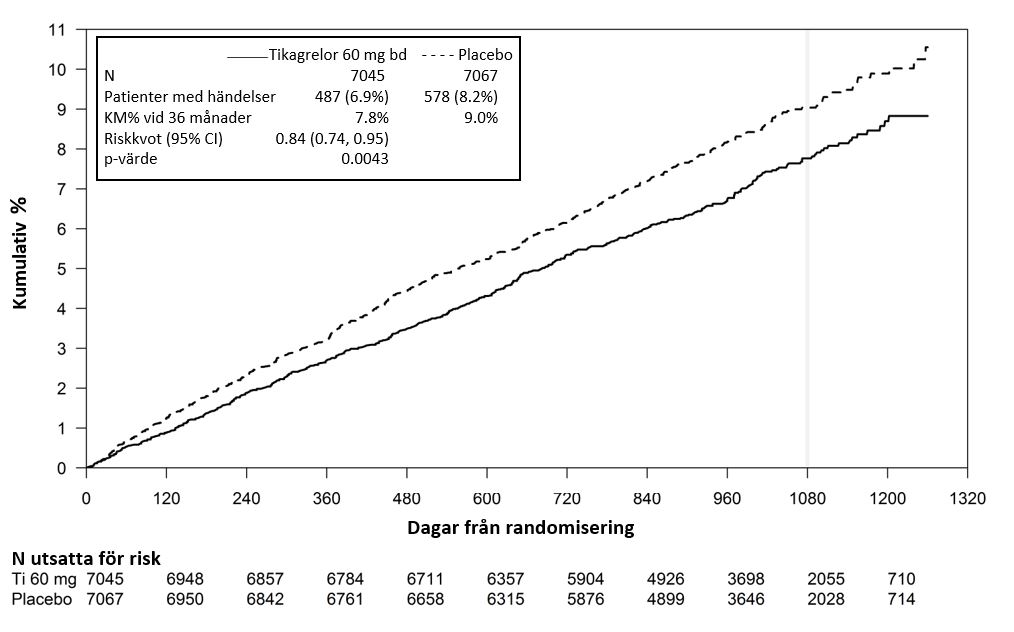 I relation till enbart ASA, reducerade tikagrelor 60 mg två gånger dagligen signifikant det primära sammansatta effektmåttet för kardiovaskulär död, hjärtinfarkt och stroke. Var och en av komponenterna bidrog till reduktionen av det primära sammansatta effektmåttet (kardiovaskulär 17 % RRR, hjärtinfarkt 16 % RRR och stroke 25 % RRR).