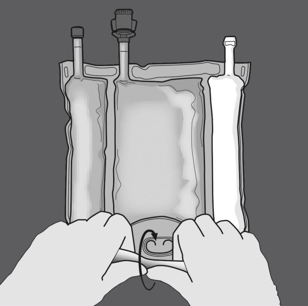 Det rekommenderas att innehållet används omedelbart efter att de icke-permanenta förslutningarna mellan de tre kamrarna har öppnats. Innehållet ska inte sparas för senare infusioner.