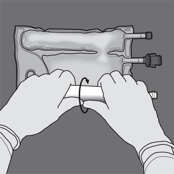 Steg 2: Vänd påsen så att du har kammaren med lipidemulsion närmast dig och rulla påsen, samtidigt som du skyddar kammaren med lipidemulsionen med händerna.