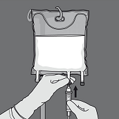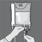 Steg 5: Avlägsna skyddslocket från administreringsporten och för in IV-infusionsaggregatet.